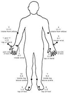 11. Now finish up by going back to the fleshy section on the top of the right hand and redoing LI-4 which completes the circuit of energy in a clockwise manner around the body